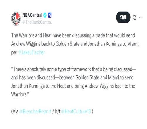 目前,两队的谈判仍在推进中,首轮签的具体顺位保护细节或将成为最终达成交易的关键。勇士希望保留更多未来筹码,而热火则渴望获得更具价值的选秀资产作为补偿。但从双方的诉求与薪资适配度来看,这桩3换1交易的达成概率极高,有望在交易截止日前尘埃落定。再见库明加,是勇士对潜力新星的放手,也是年轻球员对新生的渴求;你好维金斯,是冠军班底的重逢,也是勇士对总冠军的再一次冲刺。这桩交易的最终落地,将重塑西部季后赛格局,更会成为本赛季交易市场中最具情怀与战略意义的一笔操作。