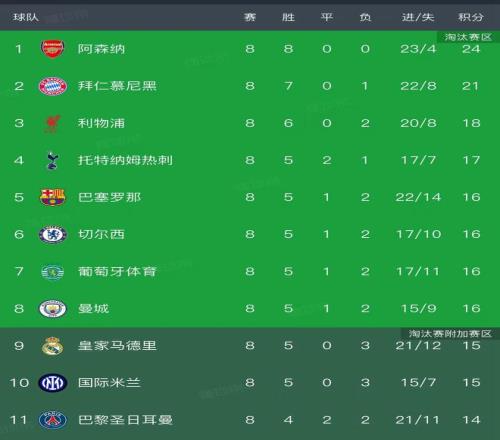 切尔西、曼城同样挤进了前八,切尔西在客场3-2力克那不勒斯,恩佐点射建功,佩德罗双响,最终的积分是16分锁定第6位置。曼城2-0战胜加拉塔萨雷,积分同样上涨到16分锁定第8的位置。前八不是英超球队的只有3队,分别是来自德甲的拜仁、西甲的巴萨和葡超的葡萄牙体育。拜仁早早锁定第二的位置,末轮同样全取三分,2-1战胜了PSV埃因霍温。巴萨4-1战胜哥本哈根,使得他们超越皇马,成为西甲球队排名最高的,以小组第5晋级。葡萄牙以第7的身份晋级16强。