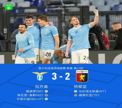 北京时间1月31日意大利足球顶级联赛 联赛 第23轮,拉齐奥主场对阵热那亚。拉齐奥佩德罗破门,卡塔尔迪破门,肯尼思-泰勒破门。热那亚马利诺夫斯基破门,维蒂尼亚破门。最终比分拉齐奥 3-2 热那亚。