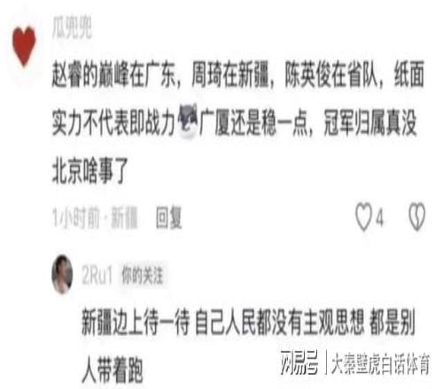 “赵睿的巅峰在广东……冠军归属真没北京啥事了…”,没想到引起赵睿破防,这名中国男篮队长意外地在该球迷评论下方回复:
