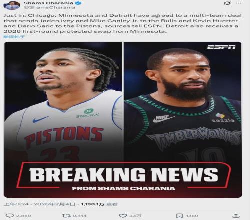 北京时间2月4日,距离本赛季交易截止日仅剩两天,今天NBA一共达成4笔交易!先来说说活塞、公牛和森林狼的三方交易:活塞得到许尔特、萨里奇和2026年首轮互换权(来自森林狼);公牛得到艾维和康利;森林狼得到现金。