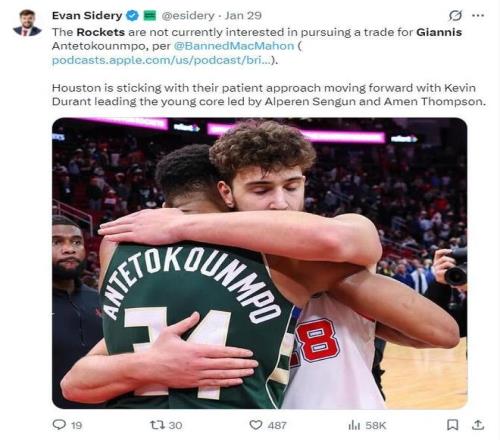 "如果字母哥真来火箭,建议直接交易哈登换回几个首轮!"