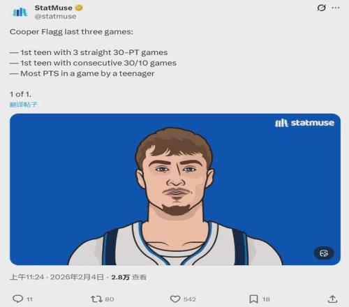 北京时间2月4日,NBA常规赛,独行侠100-110不敌凯尔特人。独行侠状元弗拉格出战36分43秒,24投12中,三分4中2,罚球11中10,空砍36分9板6助2帽1失误,正负值-2。弗拉格成为NBA历史上首个连续3场砍下30+的20岁以下球员。