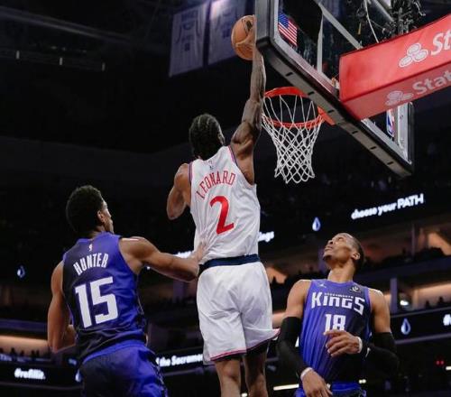 本场比赛,双方在首发阵容上面,快船这边派出的是,邓恩,桑德斯,伦纳德,科林斯和大洛佩斯,国王这边派出的是,威少,拉文,亨特,德罗赞和雷诺。首节比赛开始,国王率先拿到球权,亨特顺步冲击篮下挑落两分,打进本场比赛首个进球,科林斯手腕一抖,补篮打进也为快船开张,伦纳德旋风冲刺,腾空上篮稳稳命中,雷诺的潇洒单手抛投同样也有,伦纳德:标志性的急停中距离干拔正入网心,拉文闪电突破,利用速度优势冲击篮下擦板命中,伦纳德又挤进篮下,强起暴扣技惊四座,拉文顶着防守飞身上篮还击一球。