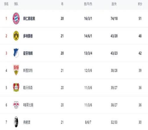 说到这里,就必须聊聊积分榜的变化了,这也是大家最关心的话题。目前拜仁依旧占据榜首位置,16胜3平1负,拿到51分,依旧是争冠的最大热门,毕竟他们的稳定性摆在那里。
