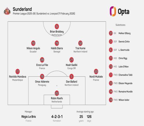 桑德兰首发:22-罗埃夫斯、20-穆杰莱、5-巴拉德、15-阿尔德雷特、17-雷尼尔多、32-休姆、27-萨迪基、28-勒费埃、10-尼尔松-安古洛、19-哈比卜-迪亚拉、9-布罗贝伊