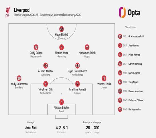 利物浦首发:1-阿利松、3-远藤航、4-范戴克、5-科纳特、26-罗伯逊、38-赫拉芬贝赫、10-麦卡利斯特、7-维尔茨、11-萨拉赫、18-加克波、22-埃基蒂克
