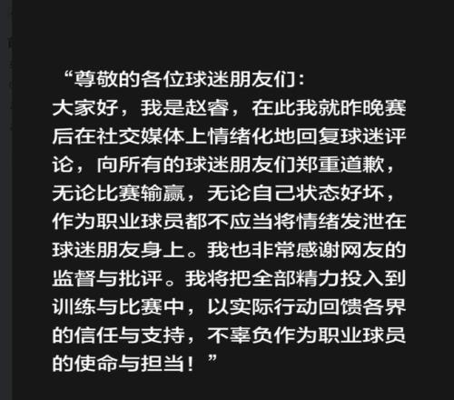 事后,赵睿在社交媒体上向新疆球迷道歉,但是仍然无法获得很多球迷的谅解,认为他的言语破坏了民族团结。
