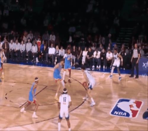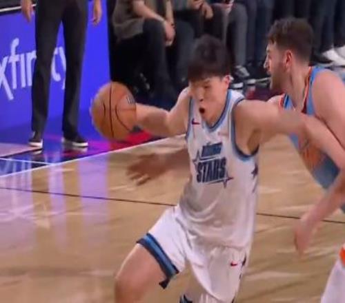 之后面对队友克林根,杨瀚森持球大跨步晃开大根完成上篮。
