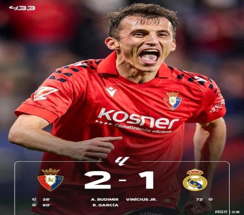 西甲第25轮,皇马客场1-2奥萨苏纳,联赛8连胜终结,先赛一场2分领跑。布迪米尔造点+点射,姆巴佩小角度破门但越位在先无效,巴尔韦德助攻维尼修斯扳平,劳尔-加西亚绝杀。