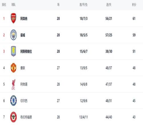 在积分榜,阿森纳依然占据榜首位置,18胜7平3负的战绩,拿到61分。赢球的曼城步步紧逼。曼城总积分达到59分,排名第2,仅仅落后阿森纳2分。冠军的争夺太激烈了,最快下一轮曼城有机会登顶。阿斯顿维拉则不断掉链子,总积分依然是51分,排名第3。曼城以48分排名第4。利物浦赢球之后,也是48分,排名第5。切尔西只拿到45分,掉到第6名。