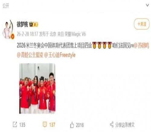 2月28报道 米兰冬奥会冠军得主徐梦桃更新社媒,晒出了与谷爱凌、苏翊鸣、王心迪的合照。徐梦桃写道: