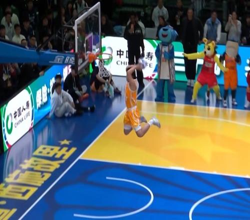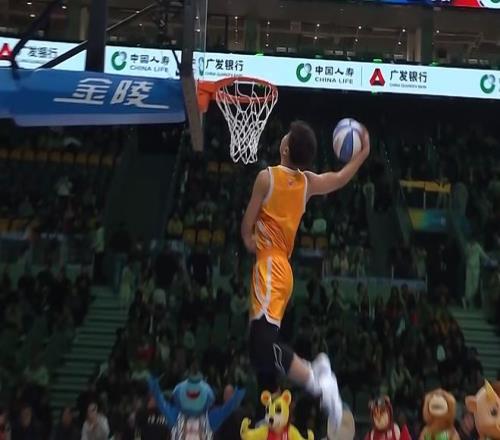 张文杰选择篮下冲出来,大风车转体暴扣,第一次失败,第二次成功,获得46分。
