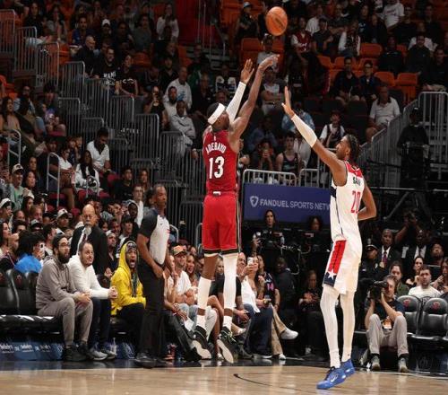 在热火150-129分大胜奇才的比赛中,阿德巴约打出生涯之夜,全场43投20中爆砍83分9板3助2断2盖帽全能数据一战刷爆数项NBA历史纪录。
