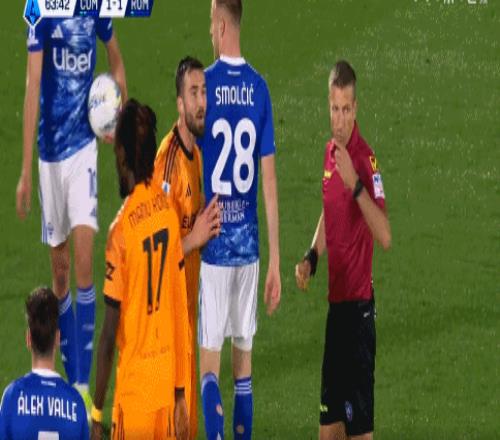 扳平比分的大黑马,越战越勇,仅仅过了6分钟,罗马再次遭遇沉重打击。科莫发动反击,韦斯利在身后拉倒迪奥,被主裁判出示第二张黄牌,两黄变一红被罚出场。罗马不得不以10人应战,局势瞬间陷入被动。