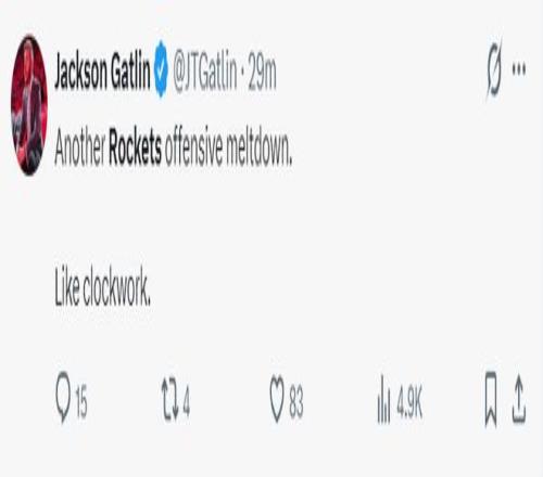 火箭记者加特林:火箭队又一次进攻崩溃了,就好像又定时闹钟一样准确无误。