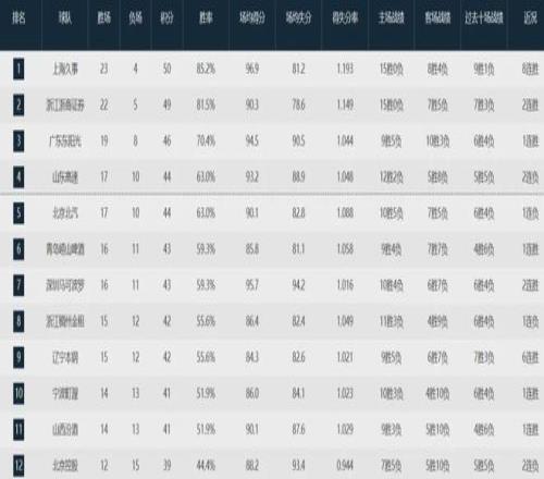 本赛季至今,北京队取得17胜10负排名联盟第五,落后于上海队(23-4)、广厦队(22-5)、广东队(19-8)和山东队(17-10)。