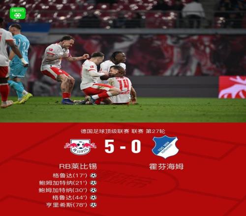 北京时间3月21日德国足球顶级联赛 联赛 第27轮,RB莱比锡主场对阵霍芬海姆。RB莱比锡格鲁达梅开二度,鲍姆加特纳梅开二度,亨里希斯破门。最终比分RB莱比锡 5-0 霍芬海姆。