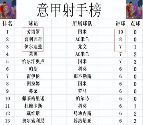 射手榜方面,劳塔罗10球继续领跑,普利西奇8球位列第2。伊尔迪兹今天打入一球后,追上莱奥和恰尔汗奥卢,三人7球并列第3。图拉姆,霍伊伦,苏莱,奥尔索利尼等人6球刚好挤入前十。